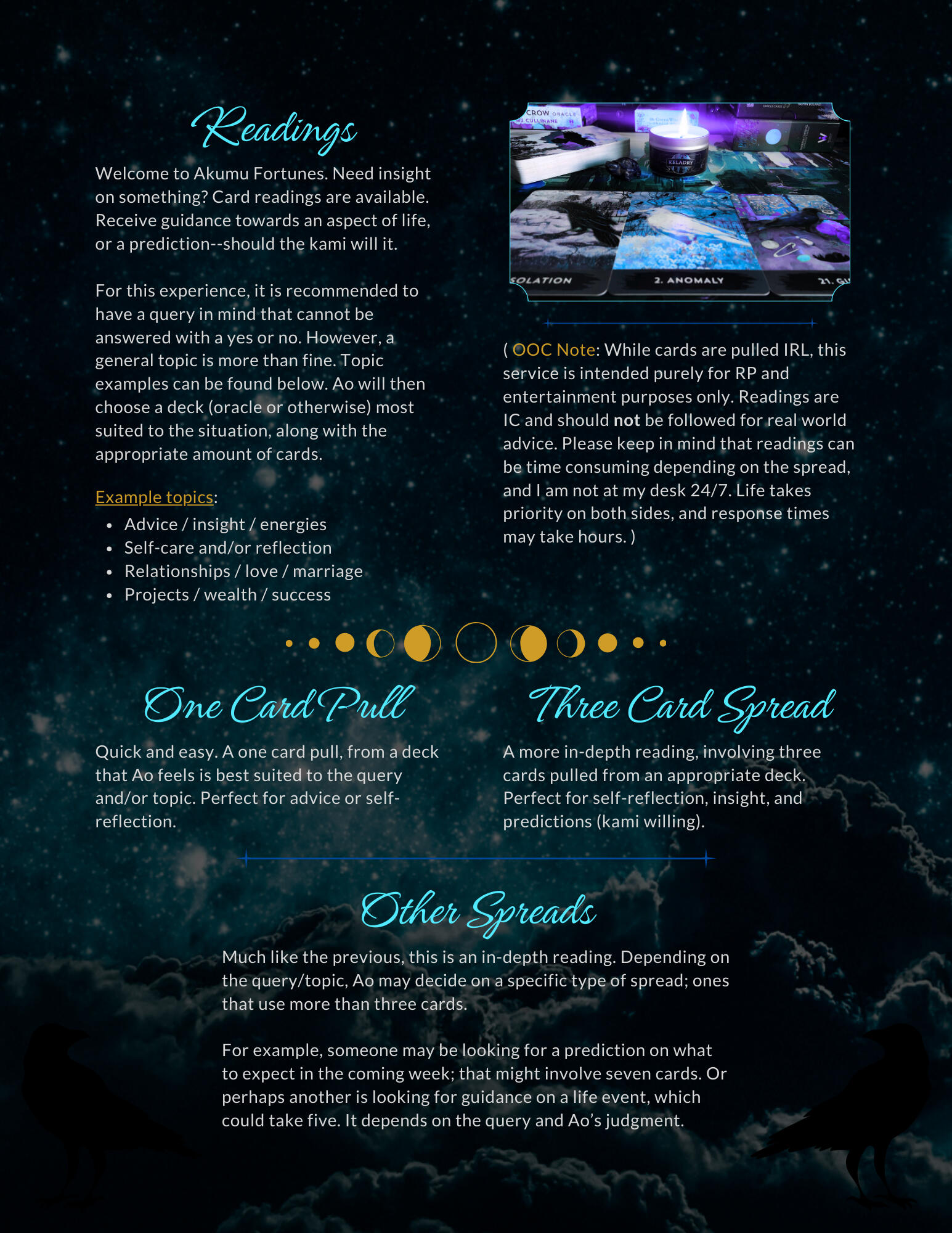 ( OOC Note: Cards are pulled IRL from tarot and/or oracle decks, intended for RP and entertainment purposes only. Readings are in-character and should not be followed for real world advice. )
